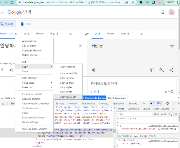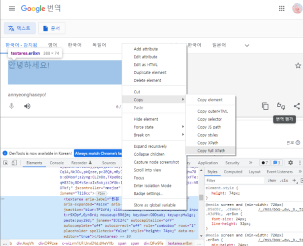원본 언어를 입력하는 창의 XPath를 구하고 번역된 언어가 나오는 창의 XPath를 구해 변수에 대입해줍니다.